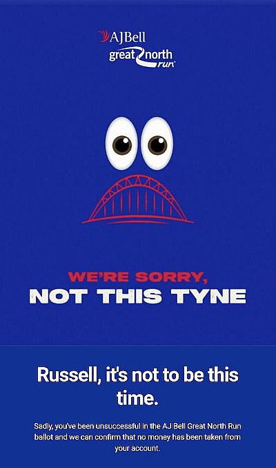 Once race I won’t be doing is the Great North Run. My official confirmation landed earlier this week, although it wasn’t a great surprise. I’ve no idea how many applicants there were for ballot places but 1.1 million for London Marathon must be a bit of a clue.