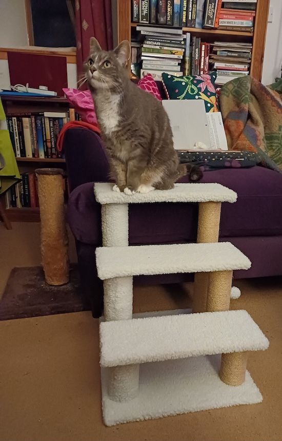 Even climbing on to the sofa is sometimes a struggle, so Matchgirl, as she often does, did lots of online research and found the perfect set of steps, designed especially for elderly felines (The Tabby Terror is now 13), and contributed more money to the Jeff Bezos Space Rocket Programme.