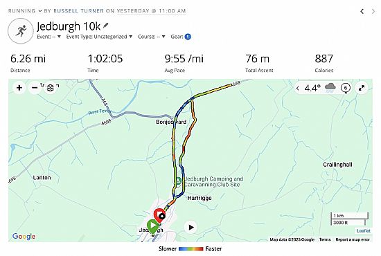 Rather than walk up the hill, I experimented with a few run/walks of 50 paces each, which helped me to the brow of the hill and the A68 where we returned to Jedburgh on the pavement. By now we were strung out enough for this not to be a problem and I was running again. The slight downhill helped. The last kilometre, back through town, included a couple of walks but got me to the finish line in 1:02, only a minute slower than the first 10k on a flat York course the week before which didn’t have any walks at all. My pacing is rubbish.