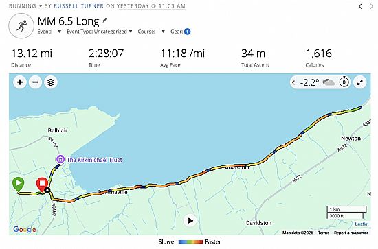 After 2:06 and 18.1k of run/walking I reached Newhall Bridge, 5mins from The Rural Retreat, and regretted not having run to the far side of Cromarty. However, I resisted temptation and found three more kilometres before returning home in 2:28. Before the run I was inclining 60:40 to doing the Manchester Marathon; today it’s back to 50:50. I’ll see how I feel in five weeks when (if) I’ve reached 18 miles.