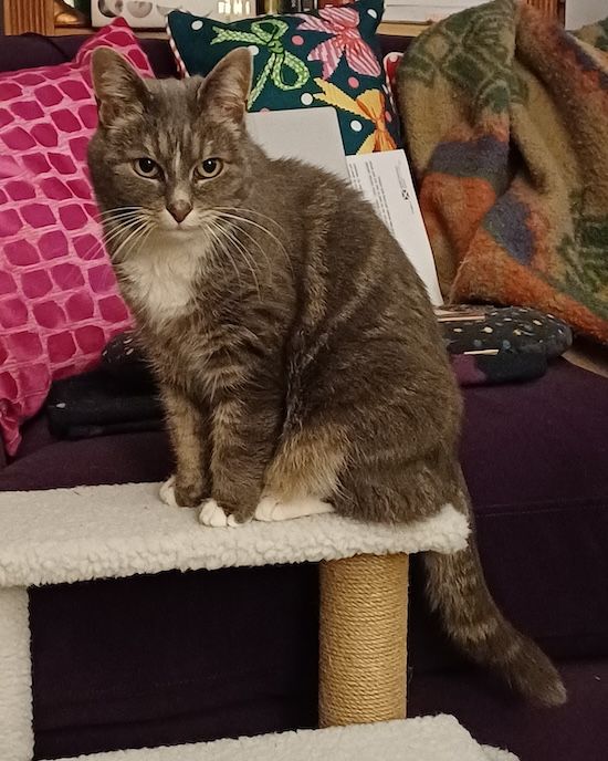 Getting older is no fun for people: dodgy hips (Matchgirl), arthritic thumbs (me), and general aches and pains (both). It’s also no fun for cats. Willow seems as spritely as ever, although it’s a long time since we’ve seen her climb to the top of the scratching post, but Pandora shows increasing signs of being a senior citizen. She can only look with longing at the shelf behind the sofa, previously one of her favourite snoozing spots, and spends increasing amounts of time on Matchgirl’s lap.
