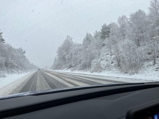 Then it was back into the rain, which turned to sleet as we climbed towards Drumochter, then enough proper snow that speed fell to 35mph and no-one risked the overtaking lane. Beyond the pass and the dual carriageway, overtaking was unavoidable when we encountered a motorcyclist who’d obviously set out without looking at the weather forecast. Poor sod.